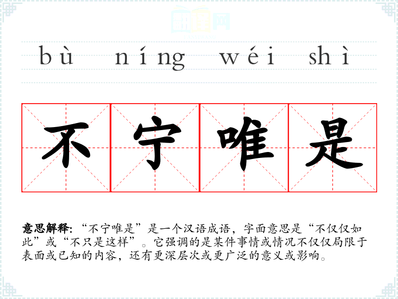 “不宁唯是”是一个汉语成语,字面意思是“不仅仅如此”或“不只是这样”。它强调的是某件事情或情况不仅仅局限于表面或已知的内容,还有更深层次或更广泛的意义或影响。