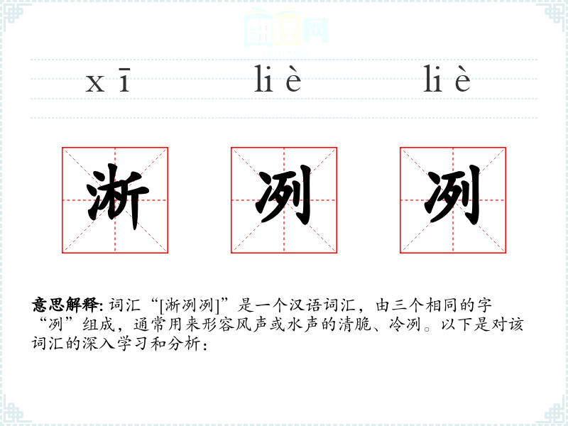 词汇“[淅冽冽]”是一个汉语词汇,由三个相同的字“冽”组成,通常用来形容风声或水声的清脆、冷冽。以下是对该词汇的深入学*和分析: