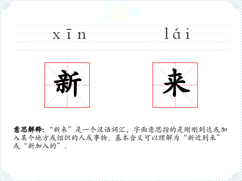“新来”是一个汉语词汇,字面意思指的是刚刚到达或加入某个地方或组织的人或事物。基本含义可以理解为“新近到来”或“新加入的”。