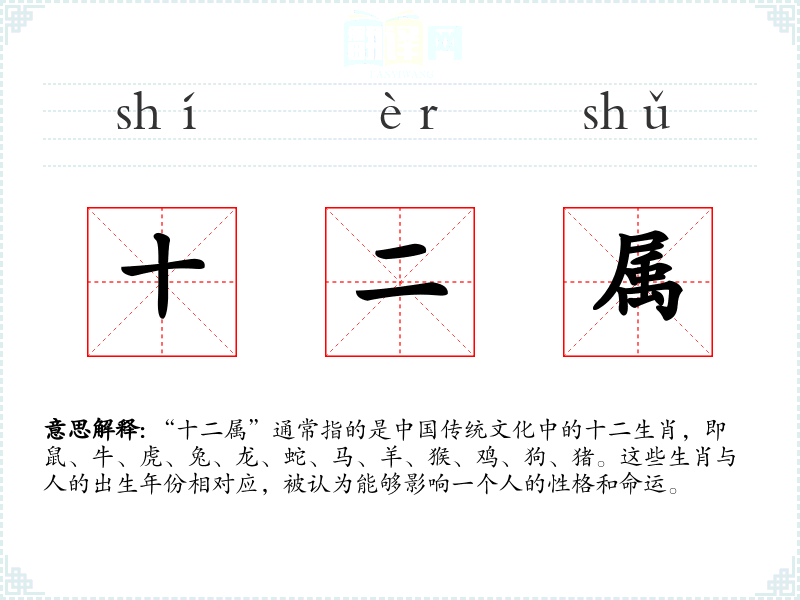 “十二属”通常指的是中国传统文化中的十二生肖,即鼠、牛、虎、兔、龙、蛇、马、羊、猴、鸡、狗、猪。这些生肖与人的出生年份相对应,被认为能够影响一个人的性格和命运。