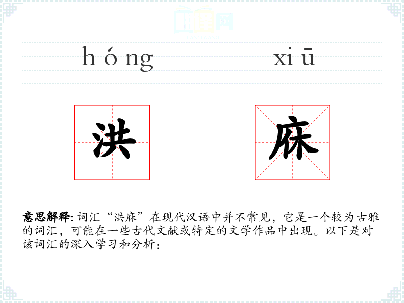 词汇“洪庥”在现代汉语中并不常见,它是一个较为古雅的词汇,可能在一些古代文献或特定的文学作品中出现。以下是对该词汇的深入学*和分析: