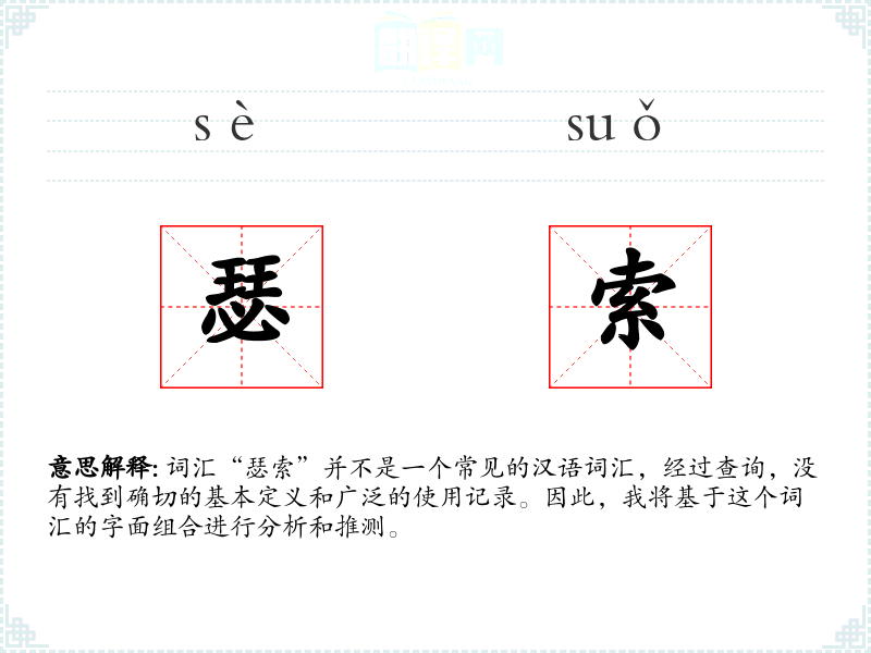 结合这两个字,我们可以推测“瑟索”可能指的是与瑟这种乐器相关的探索或寻找,或者是一种与瑟相关的绳索(如果这是一种特定的乐器配件)。