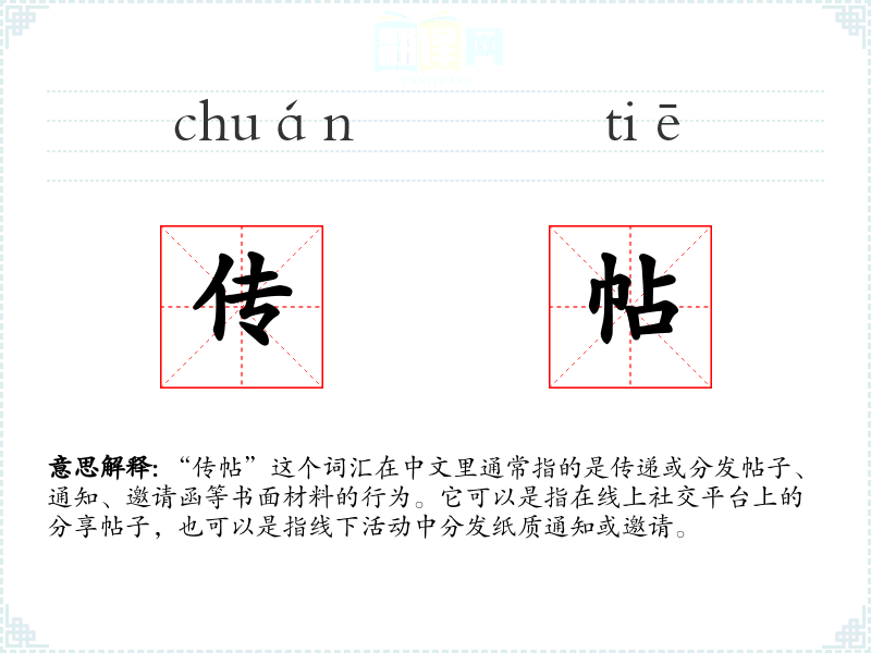 在英语中,“传帖”可以对应为“distribute invitations”或“share posts”,但其文化背景和使用情境可能有所不同。