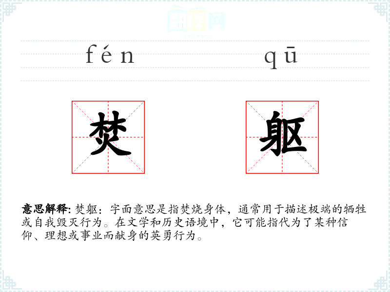 “焚躯”这个词汇通常带有一种悲壮和崇高的情感,让人联想到英勇的牺牲和无私的奉献。它可能激发人们对牺牲精神的敬佩和对生命价值的深刻思考。