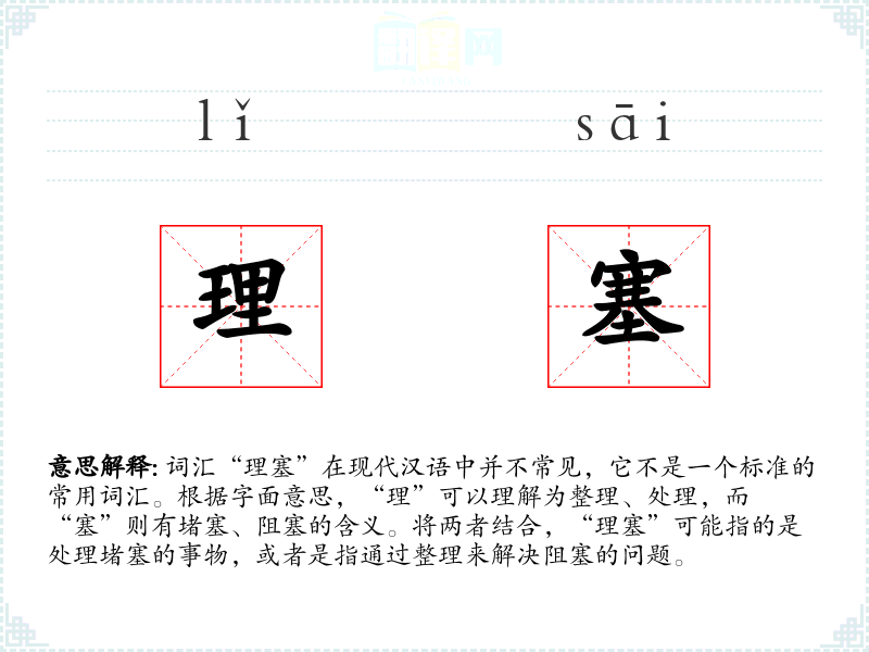词汇“理塞”在现代汉语中并不常见,它不是一个标准的常用词汇。根据字面意思,“理”可以理解为整理、处理,而“塞”则有堵塞、阻塞的含义。将两者结合,“理塞”可能指的是处理堵塞的事物,或者是指通过整理来解决阻塞的问题。