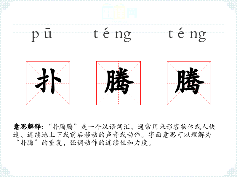 “扑腾腾”是一个汉语词汇,通常用来形容物体或人快速、连续地上下或前后移动的声音或动作。字面意思可以理解为“扑腾”的重复,强调动作的连续性和力度。