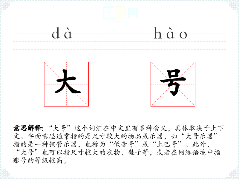 "大号"的意思解释、大号是什么意思由翻译网汉语词典查词提供。