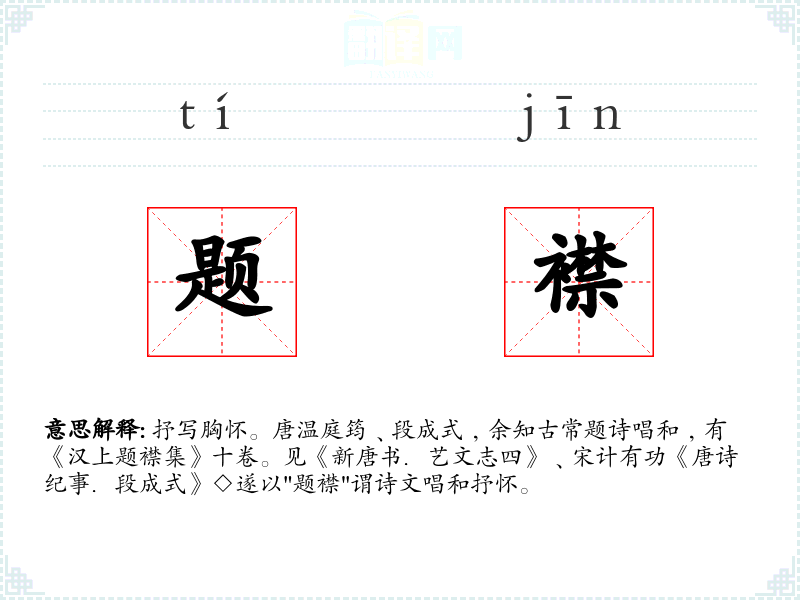 抒写胸怀。唐温庭筠﹑段成式﹐余知古常题诗唱和﹐有《汉上题襟集》十卷。见《新唐书.艺文志四》﹑宋计有功《唐诗纪事.段成式》◇遂以"题襟"谓诗文唱和抒怀。