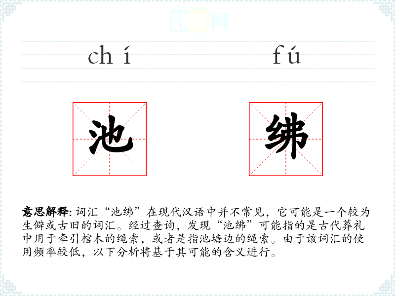 - 词源:“池绋”可能是由“池”(池塘)和“绋”(绳索)两个字组合而成。
