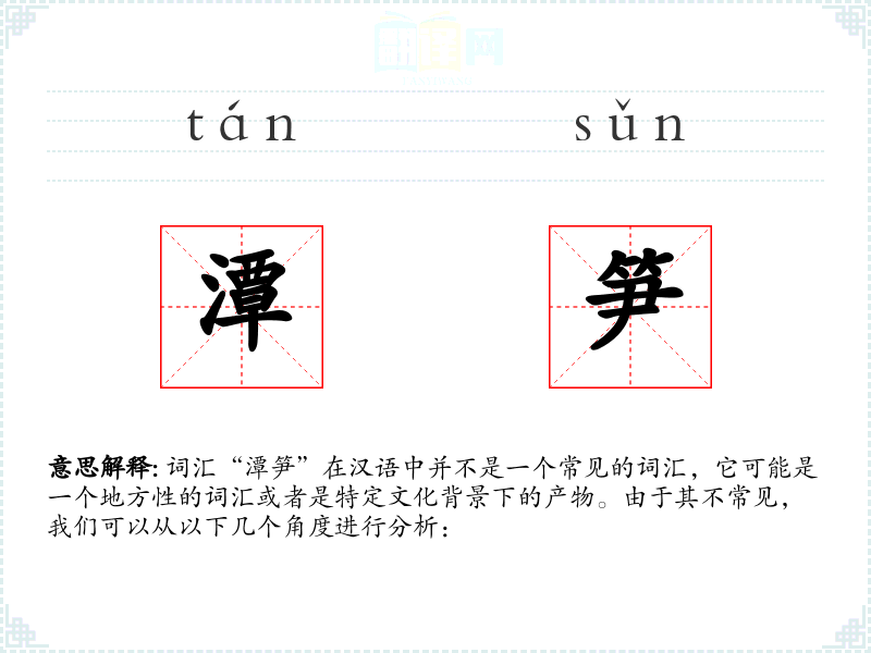 词汇“潭笋”在汉语中并不是一个常见的词汇,它可能是一个地方性的词汇或者是特定文化背景下的产物。由于其不常见,我们可以从以下几个角度进行分析: