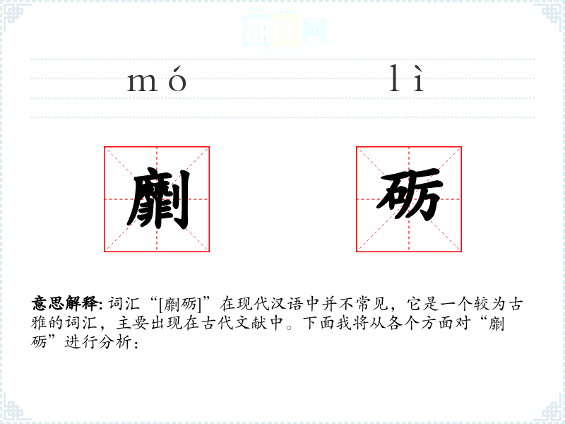 词汇“[劘砺]”在现代汉语中并不常见,它是一个较为古雅的词汇,主要出现在古代文献中。下面我将从各个方面对“劘砺”进行分析: