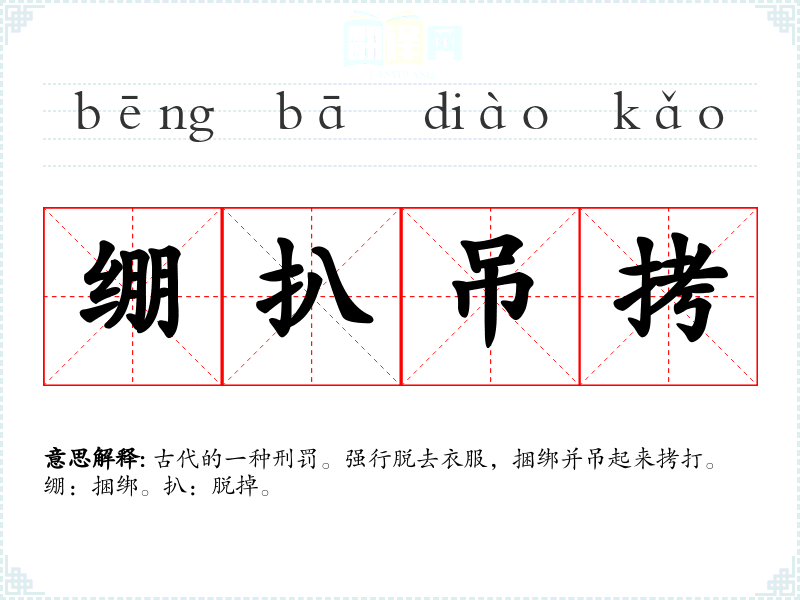 古代的一种刑罚。强行脱去衣服,捆绑并吊起来拷打。绷:捆绑。扒:脱掉。