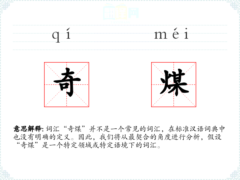 词汇“奇煤”并不是一个常见的词汇,在标准汉语词典中也没有明确的定义。因此,我们将从最契合的角度进行分析,假设“奇煤”是一个特定领域或特定语境下的词汇。