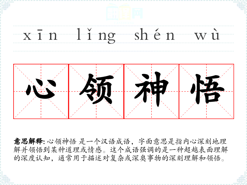 心领神悟 是一个汉语成语,字面意思是指内心深刻地理解并领悟到某种道理或情感。这个成语强调的是一种超越表面理解的深度认知,通常用于描述对复杂或深奥事物的深刻理解和领悟。