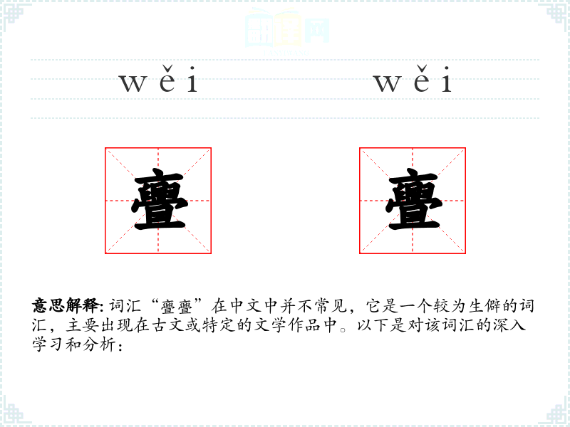 词汇“亹亹”在中文中并不常见,它是一个较为生僻的词汇,主要出现在古文或特定的文学作品中。以下是对该词汇的深入学*和分析: