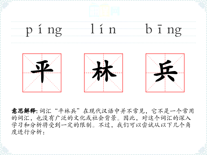 由于“平林兵”不是一个常用词汇,它在现代文学、口语或专业领域中的使用非常有限。在古代文献或军事历史研究中可能会出现这个词汇。