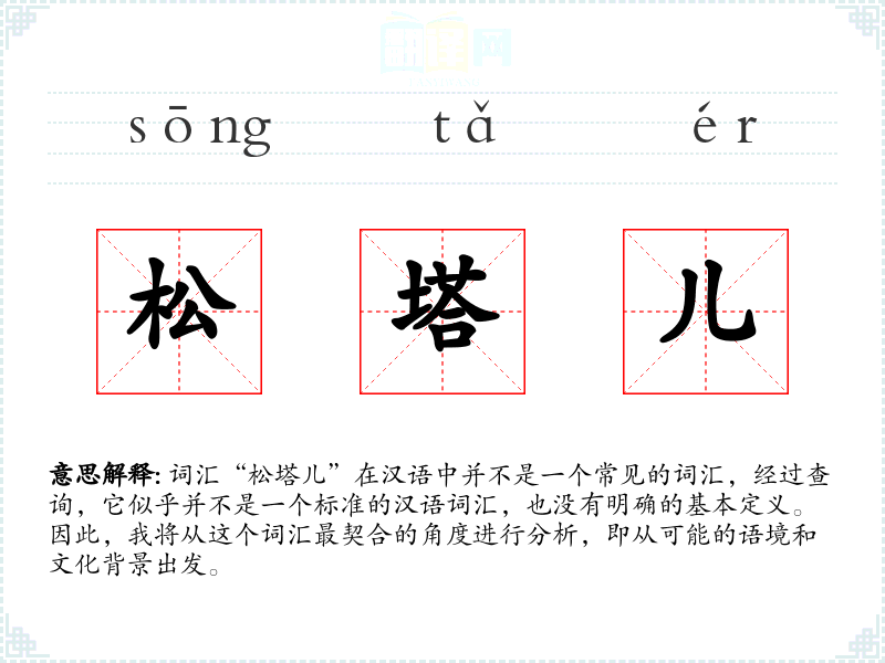 由于“松塔儿”不是一个标准的汉语词汇,我们无法给出一个确切的字面意思和基本含义。它可能是某个地区方言中的词汇,或者是某个特定社群中的俚语。