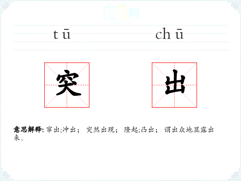 窜出;冲出; 突然出现; 隆起;凸出; 谓出众地显露出来。