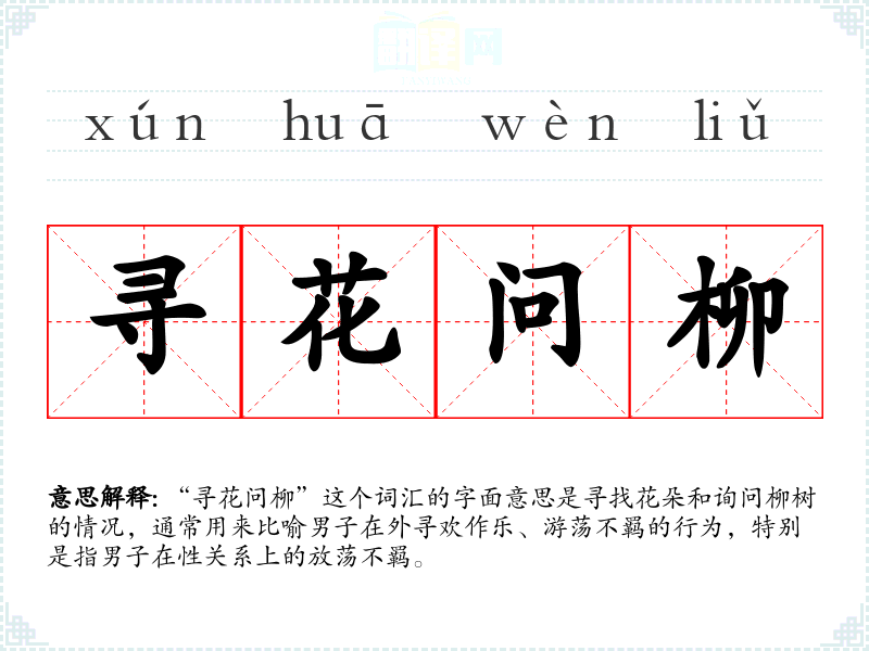 “寻花问柳”这个词汇的字面意思是寻找花朵和询问柳树的情况,通常用来比喻男子在外寻欢作乐、游荡不羁的行为,特别是指男子在性关系上的放荡不羁。