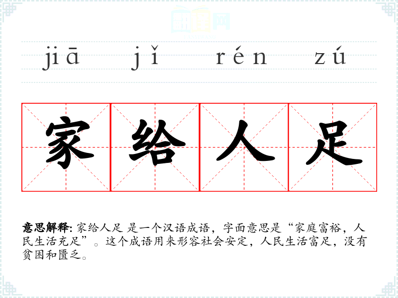 家给人足 是一个汉语成语,字面意思是“家庭富裕,人民生活充足”。这个成语用来形容社会安定,人民生活富足,没有贫困和匮乏。