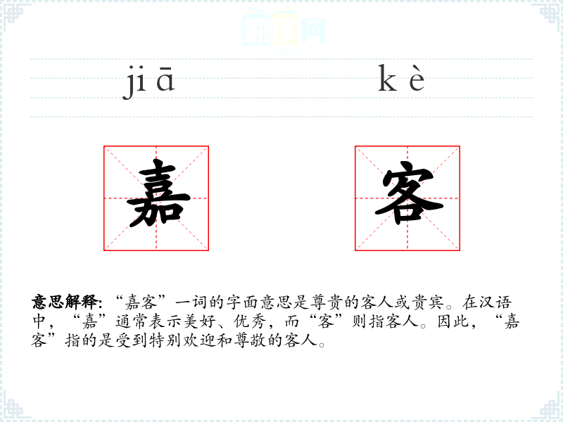 “嘉客”一词的字面意思是尊贵的客人或贵宾。在汉语中,“嘉”通常表示美好、优秀,而“客”则指客人。因此,“嘉客”指的是受到特别欢迎和尊敬的客人。