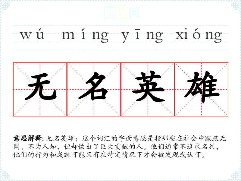 无名英雄:这个词汇的字面意思是指那些在社会中默默无闻、不为人知,但却做出了巨大贡献的人。他们通常不追求名利,他们的行为和成就可能只有在特定情况下才会被发现或认可。