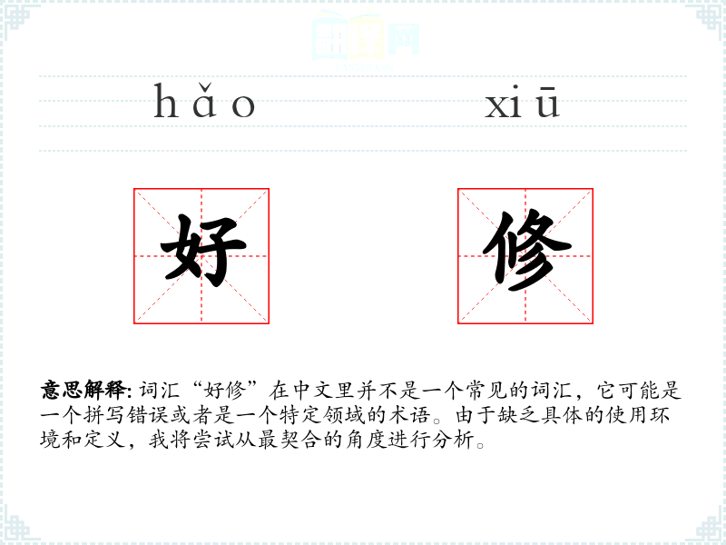 词汇“好修”在中文里并不是一个常见的词汇,它可能是一个拼写错误或者是一个特定领域的术语。由于缺乏具体的使用环境和定义,我将尝试从最契合的角度进行分析。