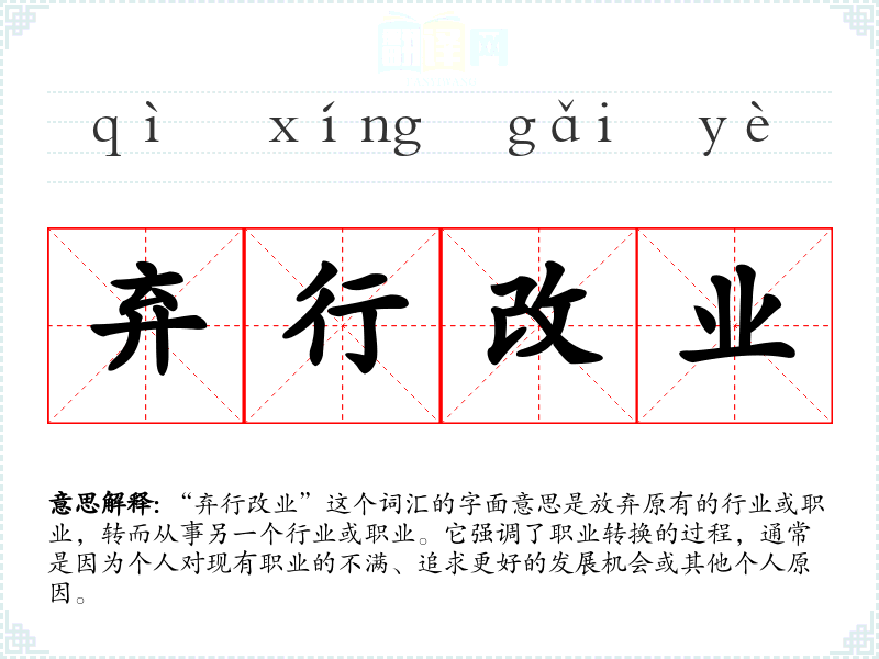 “弃行改业”这个词汇的字面意思是放弃原有的行业或职业,转而从事另一个行业或职业。它强调了职业转换的过程,通常是因为个人对现有职业的不满、追求更好的发展机会或其他个人原因。
