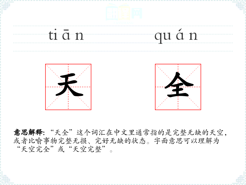 “天全”这个词汇在中文里通常指的是完整无缺的天空,或者比喻事物完整无损、完好无缺的状态。字面意思可以理解为“天空完全”或“天空完整”。