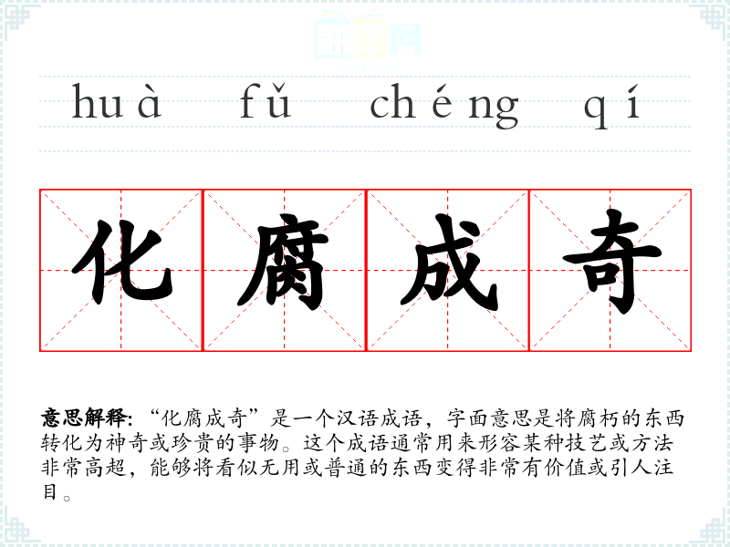 “化腐成奇”是一个汉语成语,字面意思是将腐朽的东西转化为神奇或珍贵的事物。这个成语通常用来形容某种技艺或方法非常高超,能够将看似无用或普通的东西变得非常有价值或引人注目。