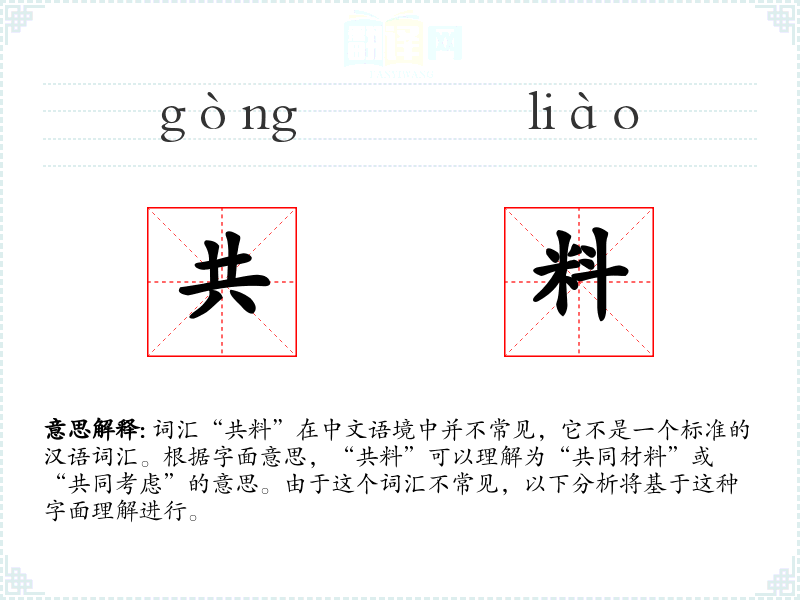 词汇“共料”在中文语境中并不常见,它不是一个标准的汉语词汇。根据字面意思,“共料”可以理解为“共同材料”或“共同考虑”的意思。由于这个词汇不常见,以下分析将基于这种字面理解进行。