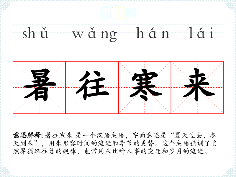 暑往寒来 是一个汉语成语,字面意思是“夏天过去,冬天到来”,用来形容时间的流逝和季节的更替。这个成语强调了自然界循环往复的规律,也常用来比喻人事的变迁和岁月的流逝。