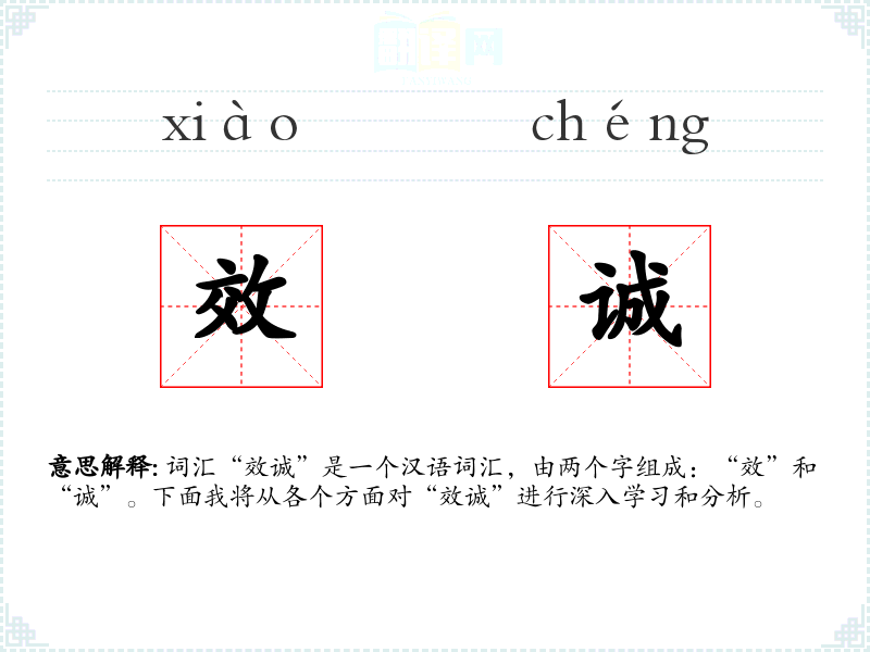 “效诚”字面意思是指表现出真诚和忠诚的行为或态度。其中,“效”意味着效仿、效忠或表现出某种行为,“诚”则指真诚、诚实。结合起来,“效诚”强调的是通过实际行动来展现忠诚和真诚。