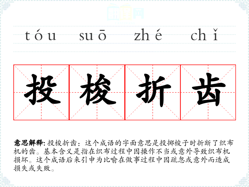 投梭折齿:这个成语的字面意思是投掷梭子时折断了织布机的齿。基本含义是指在织布过程中因操作不当或意外导致织布机损坏。这个成语后来引申为比喻在做事过程中因疏忽或意外而造成损失或失败。
