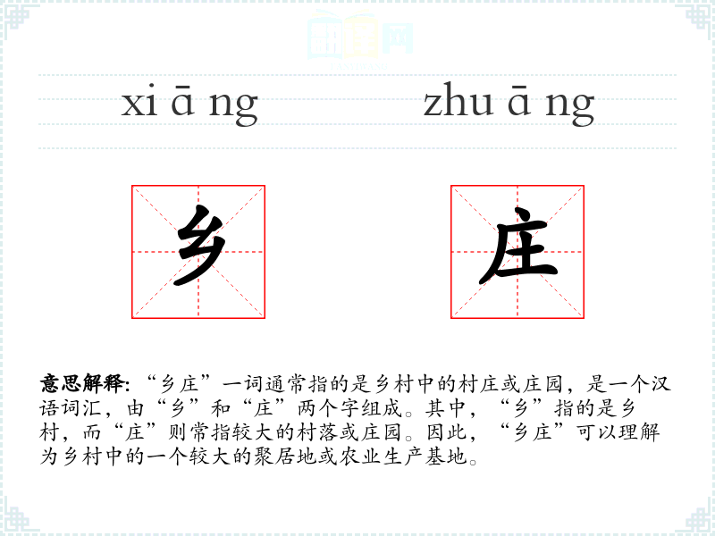 “乡庄”一词通常指的是乡村中的村庄或庄园,是一个汉语词汇,由“乡”和“庄”两个字组成。其中,“乡”指的是乡村,而“庄”则常指较大的村落或庄园。因此,“乡庄”可以理解为乡村中的一个较大的聚居地或农业生产基地。