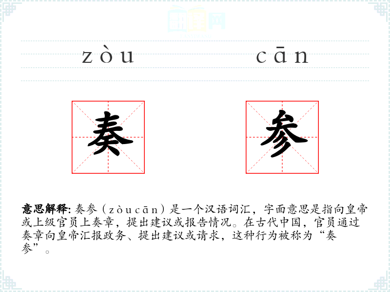 奏参(zòu cān)是一个汉语词汇,字面意思是指向或上级官员上奏章,提出建议或报告情况。在古代,官员通过奏章向**汇报政务、提出建议或请求,这种行为被称为“奏参”。