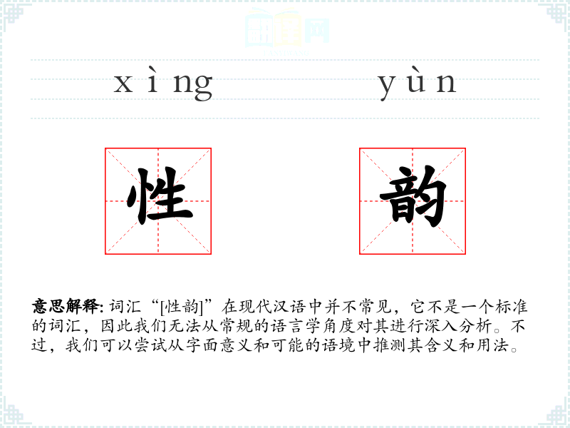 总的来说,“性韵”这个词不是一个标准词汇,它的含义和用法需要根据具体语境来解释。在语言学习和表达中,我们可以尝试创造性地使用这个词汇,以丰富我们的语言表达。