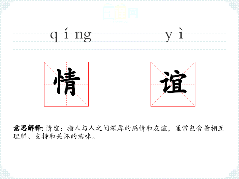 情谊:指人与人之间深厚的感情和友谊,通常包含着相互理解、支持和关怀的意味。