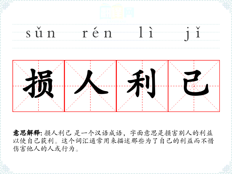 损人利己 是一个汉语成语,字面意思是损害别人的利益以使自己获利。这个词汇通常用来描述那些为了自己的利益而不惜伤害他人的人或行为。