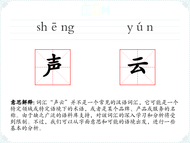 词汇“声云”并不是一个常见的汉语词汇,它可能是一个特定领域或特定语境下的术语,或者是某个品牌、产品或服务的名称。由于缺乏广泛的语料库支持,对该词汇的深入学习和分析将受到限制。不过,我们可以从字面意思和可能的语境出发,进行一些基本的分析。