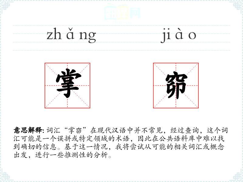 由于“掌窌”不是一个标准的汉语词汇,我们无法给出确切的字面意思和基本含义。如果“掌窌”是某个特定领域的术语,那么它可能指的是与手掌或掌管相关的某种特定动作、工具或状态。