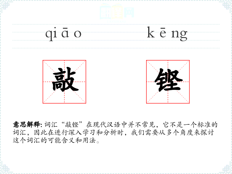 “敲铿”这个词汇的字面意思并不明确,它可能是由两个动作性词汇“敲”和“铿”组合而成。其中,“敲”通常指的是用硬物击打某物,而“铿”则形容金属或其他硬物相击时发出的响亮声音。因此,“敲铿”可能指的是一种敲击金属或其他硬物时发出的响亮声音。