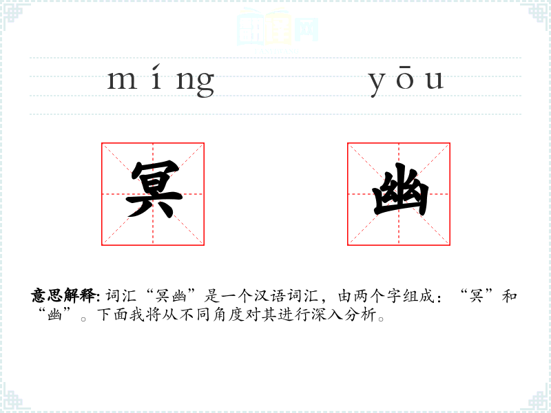 - 在英语中,类似的词汇可能是“mystical”或“obscure”,但“冥幽”更强调深邃和神秘的结合。