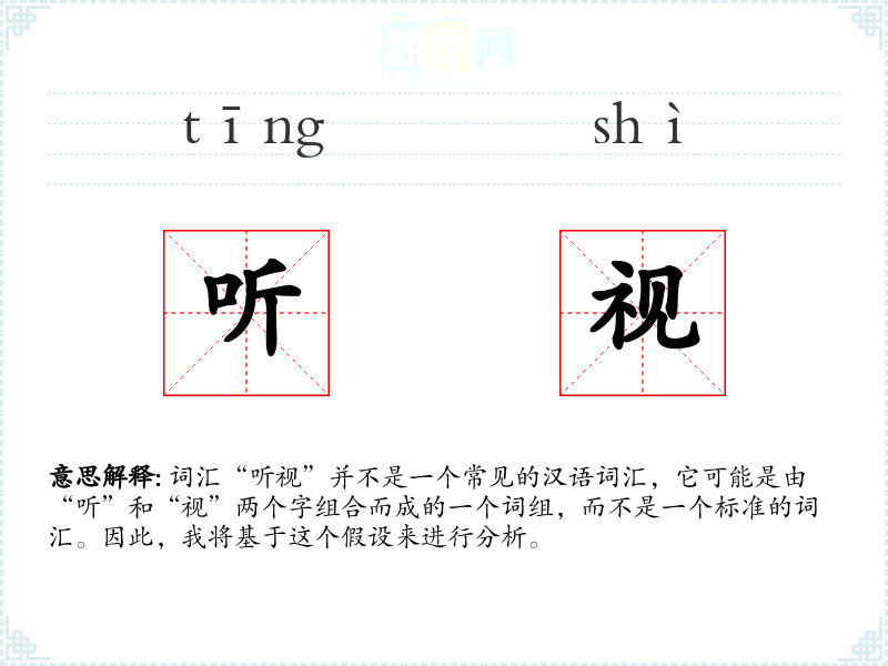 词汇“听视”并不是一个常见的汉语词汇,它可能是由“听”和“视”两个字组合而成的一个词组,而不是一个标准的词汇。因此,我将基于这个假设来进行分析。