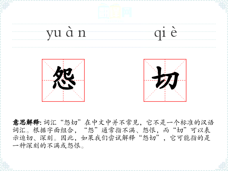 词汇“怨切”在中文中并不常见,它不是一个标准的汉语词汇。根据字面组合,“怨”通常指不满、怨恨,而“切”可以表示迫切、深刻。因此,如果我们尝试解释“怨切”,它可能指的是一种深刻的不满或怨恨。