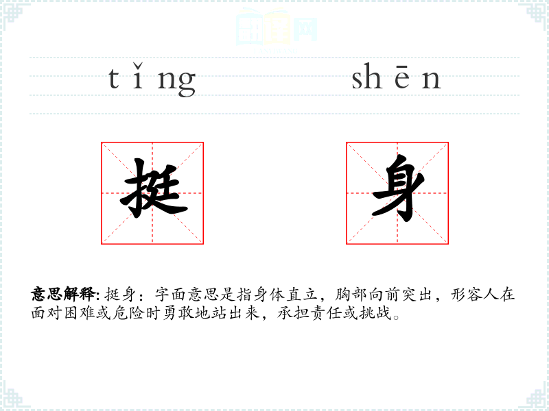 挺身:字面意思是指身体直立,胸部向前突出,形容人在面对困难或危险时勇敢地站出来,承担责任或挑战。