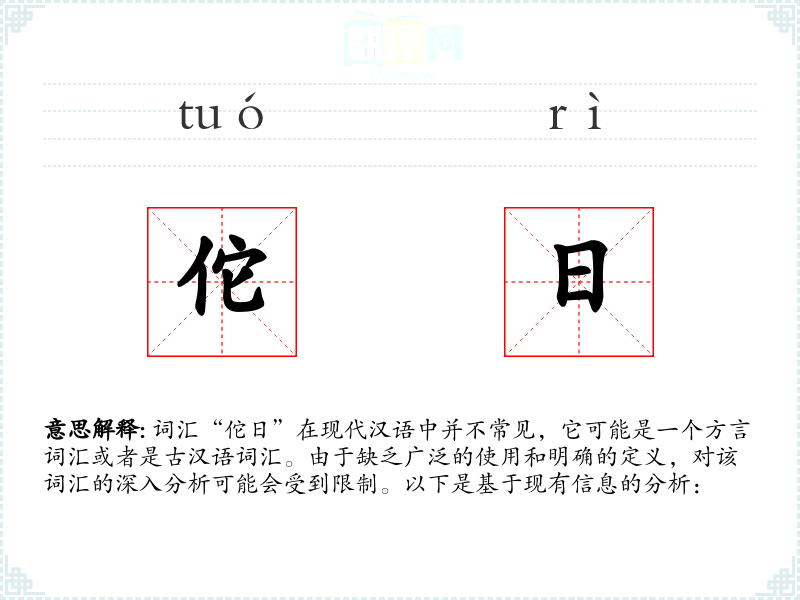 词汇“佗日”在现代汉语中并不常见,它可能是一个方言词汇或者是古汉语词汇。由于缺乏广泛的使用和明确的定义,对该词汇的深入分析可能会受到限制。以下是基于现有信息的分析: