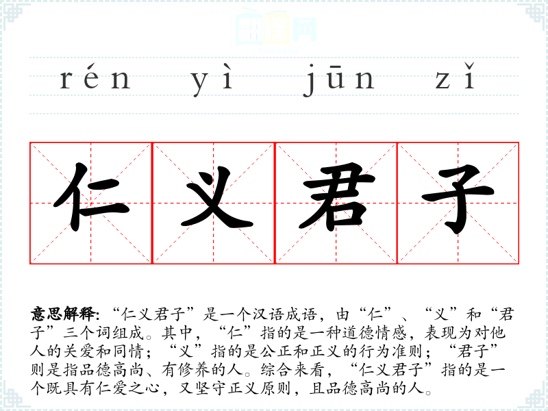 “仁义君子”是一个汉语成语,由“仁”、“义”和“君子”三个词组成。其中,“仁”指的是一种道德情感,表现为对他人的关爱和同情;“义”指的是公正和正义的行为准则;“君子”则是指品德高尚、有修养的人。综合来看,“仁义君子”指的是一个既具有仁爱之心,又坚守正义原则,且品德高尚的人。