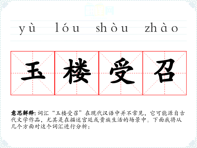 词汇“玉楼受召”在现代汉语中并不常见,它可能源自古代文学作品,尤其是在描述宫廷或贵族生活的场景中。下面我将从几个方面对这个词汇进行分析: