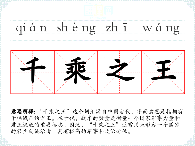 “千乘之王”这个词汇源自**古代,字面意思是指拥有千辆战车的君王。在古代,战车的数量是衡量一个国家军事力量和君王权威的重要标志。因此,“千乘之王”通常用来形容一个国家的君主或统治者,具有极高的军事和政治地位。